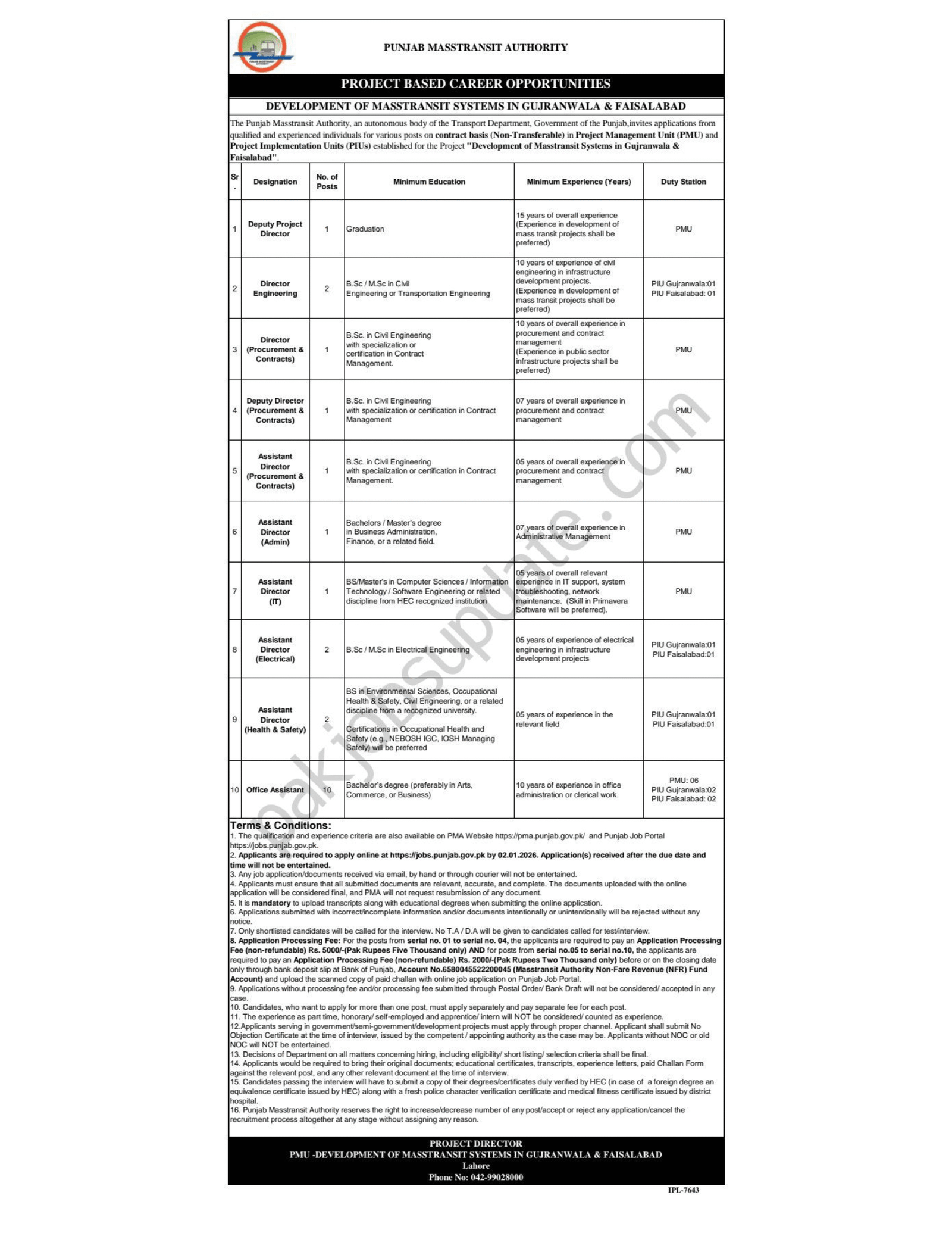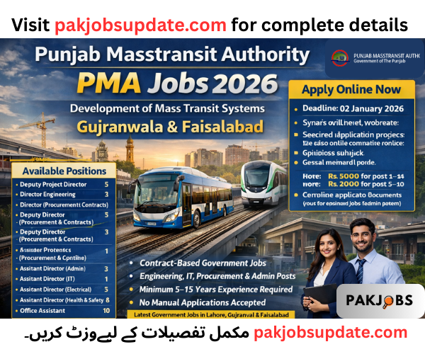 The Punjab Masstransit Authority (PMA) has officially announced new project-based job opportunities for the Development of Mass Transit Systems in Gujranwala & Faisalabad. This is an excellent opportunity for experienced professionals who want to contribute to a major public infrastructure project and secure a position in the government sector.